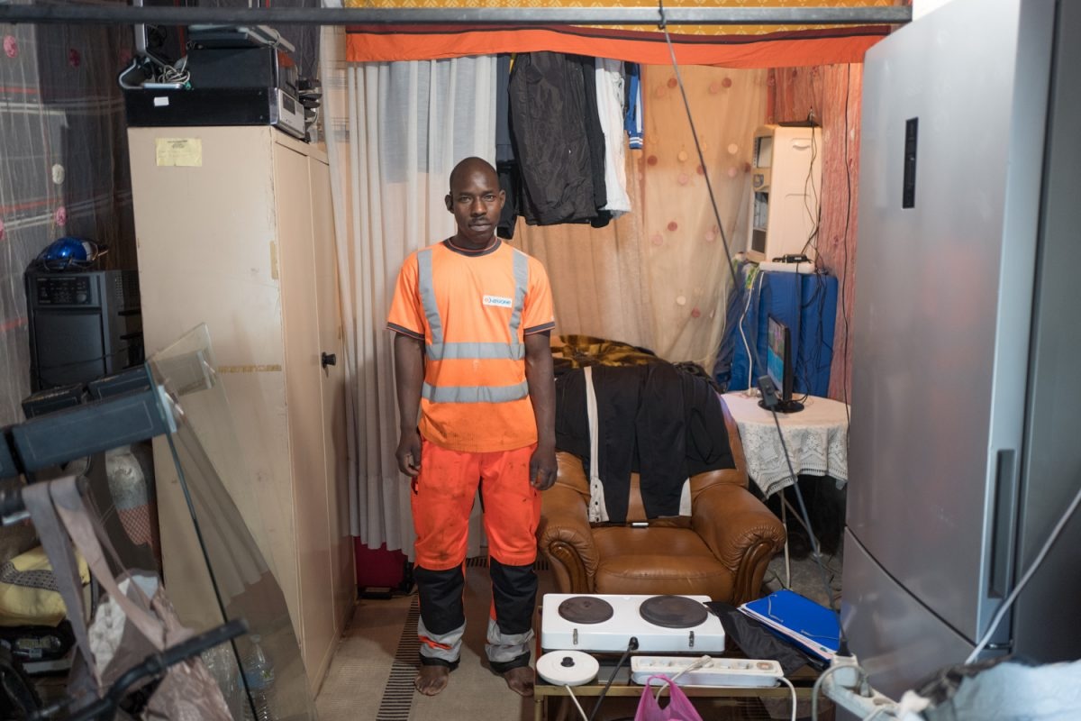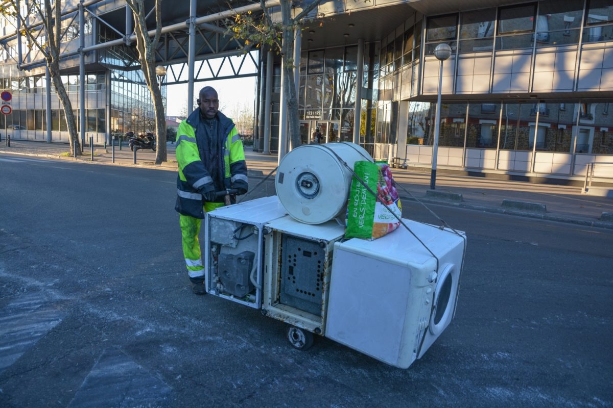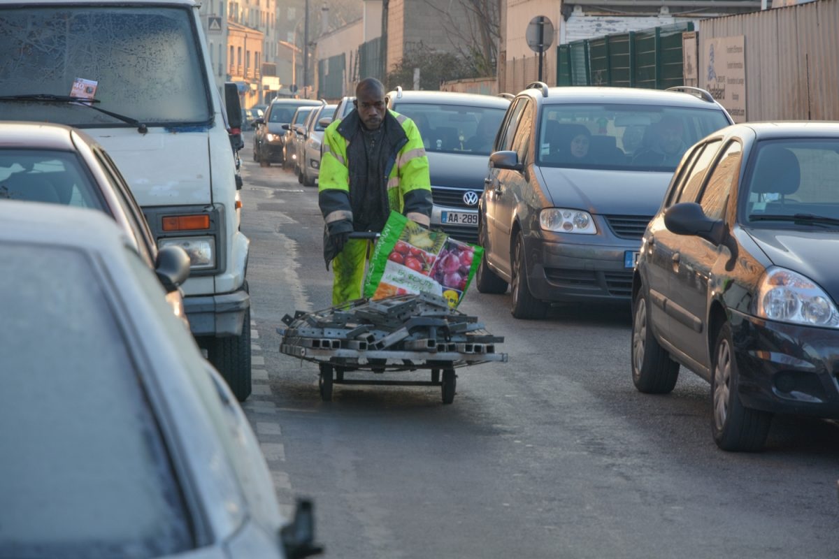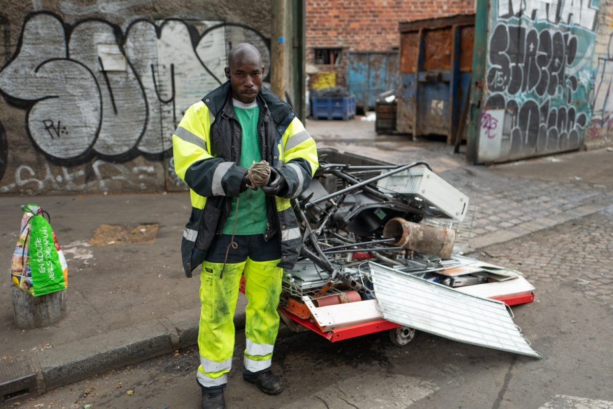 Sidiki a fui le Mali en guerre. Tous les jours, il parcourt une trentaine de kilomètres dans la banlieue parisienne pour glaner des objets abandonnés dans la rue qu’il répare ou revend aux ferrailleurs. Paradoxalement, sa tenue fluo, identique à celle des agents de propreté, le rend visible et le protège des ennuis.
